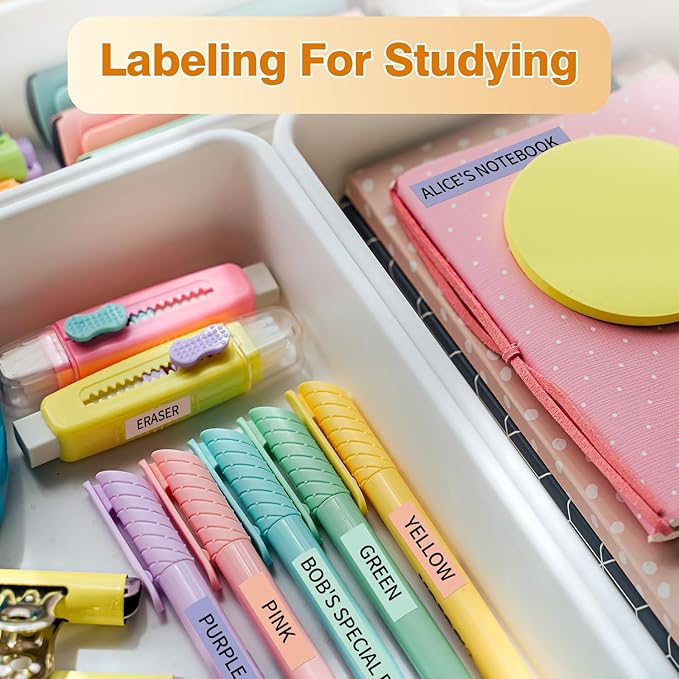 - [ Widely use ] The satisfactory-quality label maker tapes that adhere to plastic, paper, metal, wood, and glass and is ideal for labeling office supplies, electronic accessories, tools, kitchen items, garage equipment, containers, supply cabinets, storage boxes, personal items, crafts, gifts, files and more for identify items and quickly organize