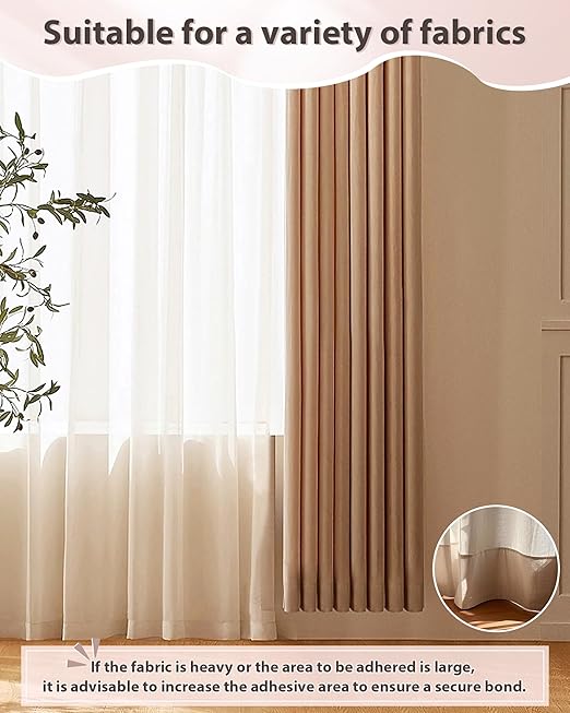 - 【No sewing or ironing】 Cut the hem tape to the length you need, and just peel off the protective backing and firmly press against the fabric, no need to sew, glue, or iron, very easy to use; The double stick tape can be easily torn by hand.