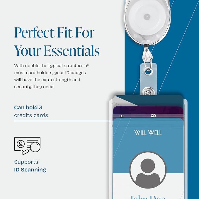 Will Well ID Badge Holders with Clip and Keyring - Vertical Clear Plastic 3.7" x 2.5" Sleeves Fit Up to 3 Cards - Retractable 24" UHMWPE Fiber Pull Cords - 2-Pack, Transparent White Reels