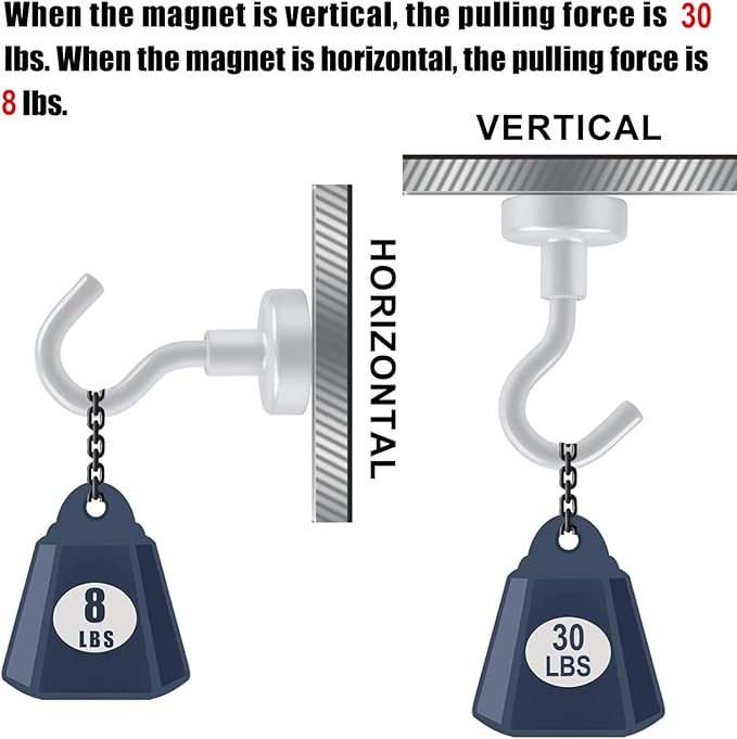 - 【Hanging Capacity】 Silver magnetic utility hooks are great for hanging accessories on the metal surface. They are able to sustain maximum weight up to 30 lbs on vertical hanging and the power reduced by 2/3 on horizontal hanging.