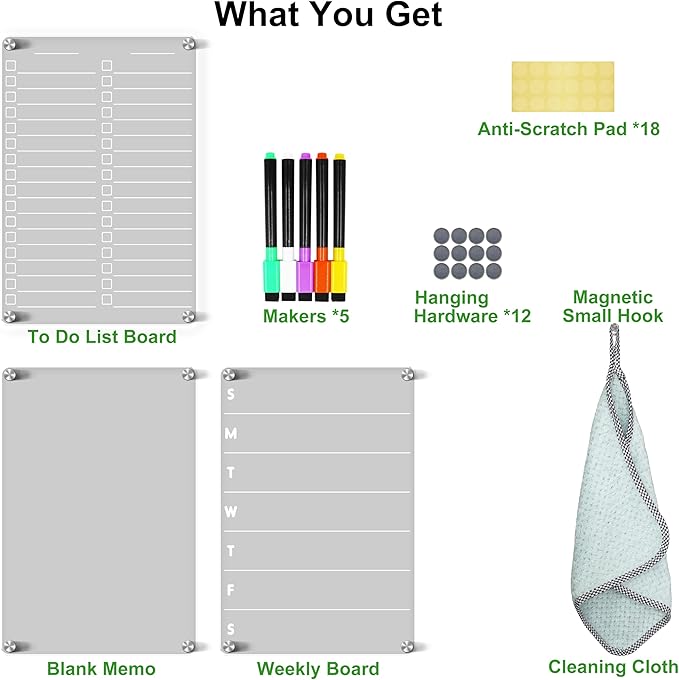 - [Easy to Mount on All Smooth Surfaces] Magnetic clear dry erase board for fridge set can be firmly attached to the refrigerator or various metal surfaces, with very strong grip. Acrylic magnetic fridge to do list set also included hanging hardware so you can mount the board on non-magnetic surfaces, such as glass or wood. You can also use the hanging hardware on refrigerators with magnetic surfaces if you are concerned about scratching the surface.