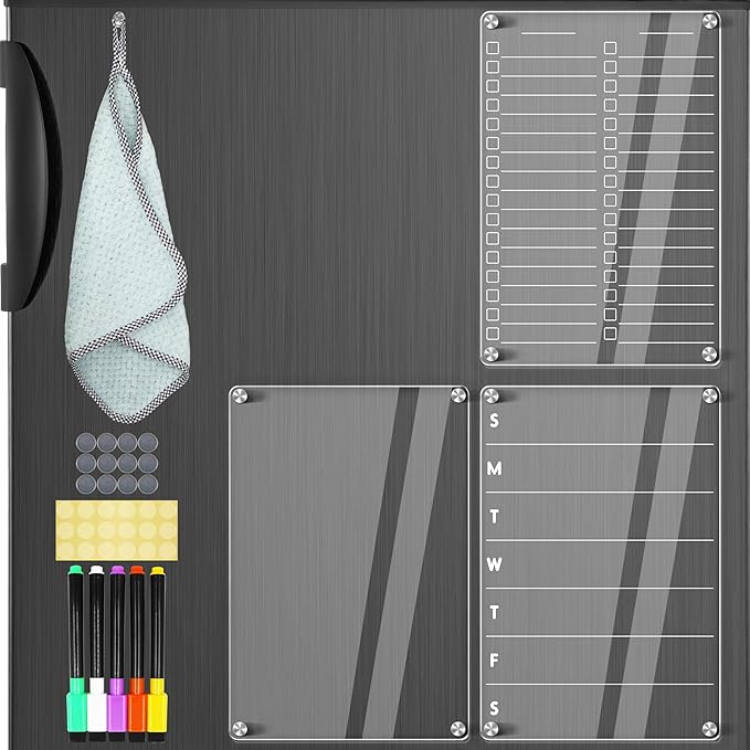 - [Easy to Write, Easy to Read, Easy to Erase] Our 3 Pcs fridge whiteboard magnetic is made of 0.12 inches clear thick acrylic, not easy to scratch and break. The magnetic clear dry erase board for fridge surface is easy to clean and erase, you just use our cloth with water for complete cleaning. Your magnetic meal planner for refrigerator without leaving any stains or ghosting.