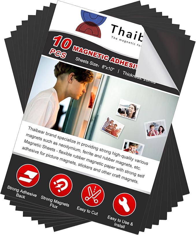 - 🌼【SIZE AND QUANTITY】10 pieces flexible magnetic sheets with strong adhesive backing, Each adhesive magnetic sheet measures 8'' x 10'', ultra thick 20mil (0.5 mm) long magnet sheet. Add larger and more magnet tape sheets for heavier things.