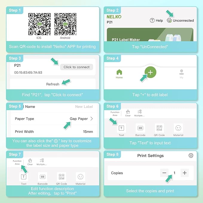 - Easy to Use: NELKO label printer compatible with IOS & Android Phone via bluetooth connection. Step 1: Download "Nelko" APP from Google Play or App Store. Step 2: Install the paper roll. Step 3: Connect the P21 bluetooth within APP. Step 4: Choose a quick template and start printing. It is not compatible with Google phones on Android 14. This label maker machine with tape APP included more than 90 +Fonts, 10+ Languages, 450+ Materials. (Note: This label maker doesn't work with computers)