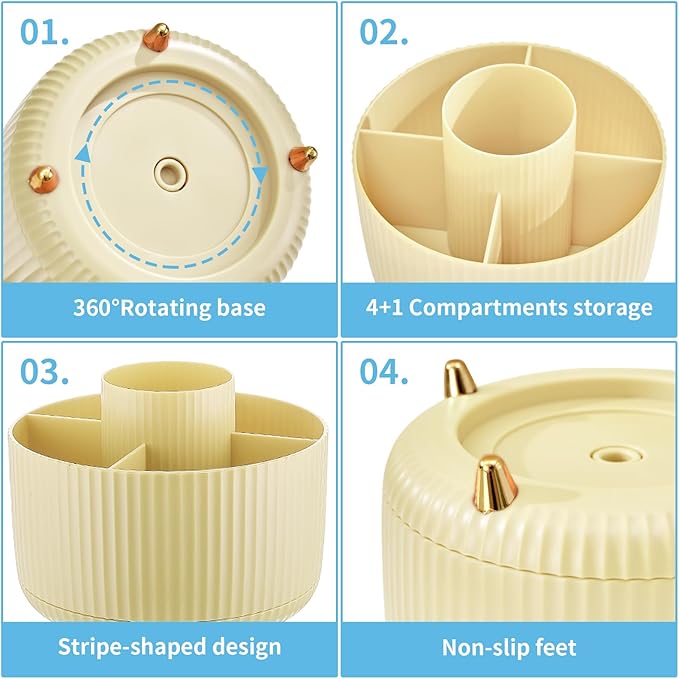 - 【Multipurpose Desktop Organizer】: This rotating storage organizer is perfect for pencils, cosmetics, bathroom necessities, toiletries, and even kitchen utensils. Try it in your craft room, playroom, laundry/utility room, and even inside bathroom cabinets or under the sink; Store extra office supplies like painting pens, correction tape, scissors, TV Remote, and more; Even headphones or a charger will no longer be lying around in the future! Maximize your vertical space and keep your desk clear.