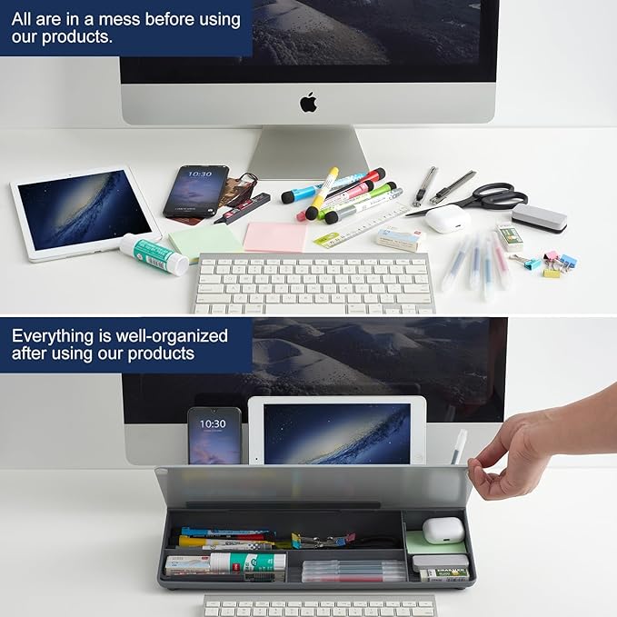 - HIDDEN STORAGE & PAD/MOBILE TRAY: De-clutter your desk by storing markers, magnetic eraser and other desktop accessories in the opening drawer or place markers on the accessory tray for quick access. And one more long tray on the top of the dry erase white board for your pad or mobile.