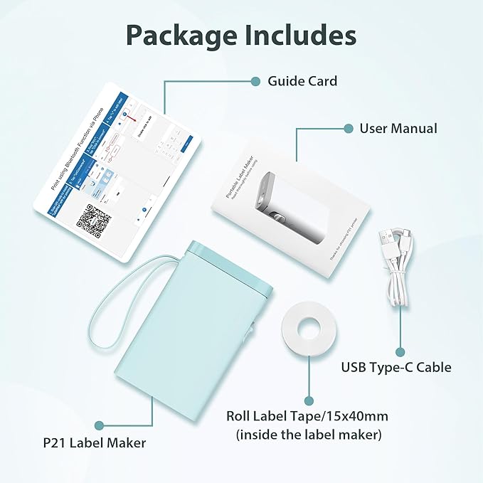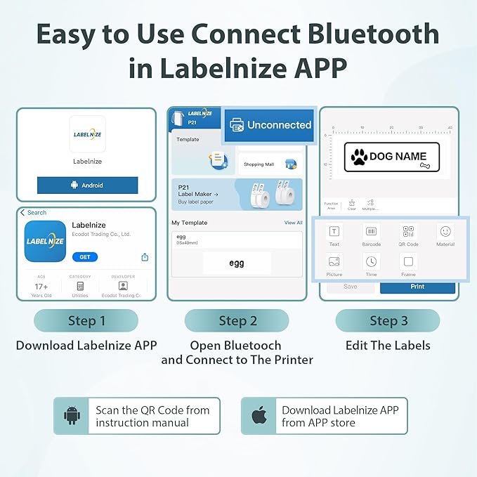 - 【Easy to Use】The bluetooth label maker is compatible with IOS and Android phones via wireless Bluetooth connection. Step 1: Download the "Labelnize" APP from Google Play or App Store.Step 2: Install the paper roll. Step 3: Connect P21 Bluetooth in APP. Step 4: Select Quick Template and start printing. (Note: Not applicable to computers)