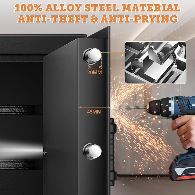 - 【STURDY HOME SECURITY SAFE BOX】The fireproof home safe is made of solid cold rolled steel integrally welded with recessed pry-resistant door, durable steel construction with 3 enhanced steel locking bolts to keep your property safe. Scratch and stain resistant powder coating protects the safe from rust and damage; Built-in felt pad keep your guns, jewelry or other valuables safe and from scratching