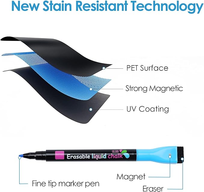 - Cost-effective Sets: Package include: 3*liquid chalk markers, 1*rag and 1*12''x 8'' black dry erase board. Ideal complete set for home, office, or classroom. The colors of the chalk markers are super bright and look great up against the black magnet board sheet, which is easier to read, please follow the instruction for chalk markers before use.