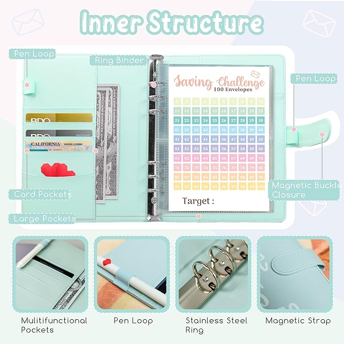 - 【Premium Material】 Crafted with top-quality waterproof PU leather, our binder books ensure durability. The see-through storage sleeve for the tracker card ensures reusability and effortless progress tracking. Cash pockets, numbered from 1-100, support systematic savings, establishing this binder as the perfect savings plan ally.
