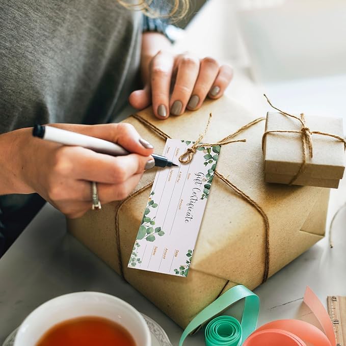 50 Sets Gift Certificate for Business with 50 Pcs Envelopes Blank Gift Certificate Cards with Name and Address Rustic for Beauty Salon Restaurants Birthday Client (Eucalyptus Leaves,4.72 x 2.36 Inch)