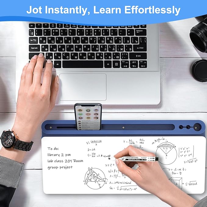 - Multiple Functions - To enhance the overall convenience of the product, this whiteboard includes 1 large pen holder, 2 small pen holders and 1 slot on the top which can hold 3 markers, a tablet and a phone. Equipped with charging port notch in the slot, the desk board is a good option to realize office charging, and you can charge your phone quickly. This dry erase board is more ergonomic with the perfect ramp design and non-slip design, which can make itself be used as keyboard pad.