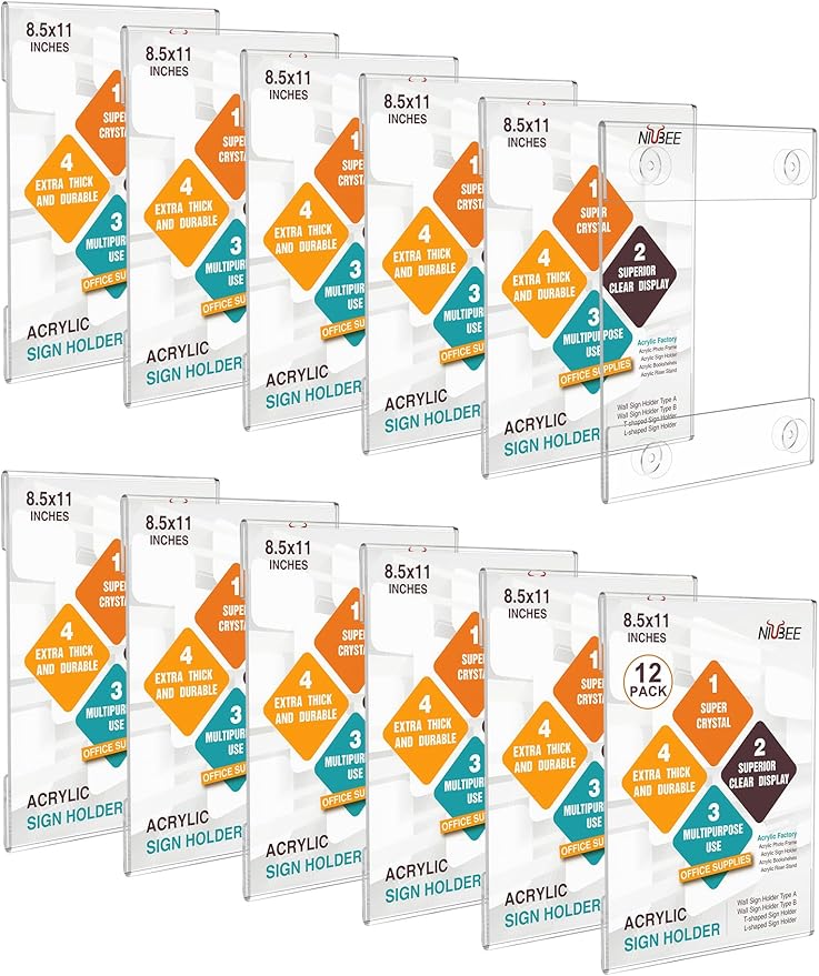 NIUBEE Acrylic Window Sign Holder with Suction Cup 8.5 X 11, Clear Acrylic Frames Glass Door Wall Mount Advertising Signage Sign Holder for Mall, Office, Home, Store, Restaurant(12 PACK)