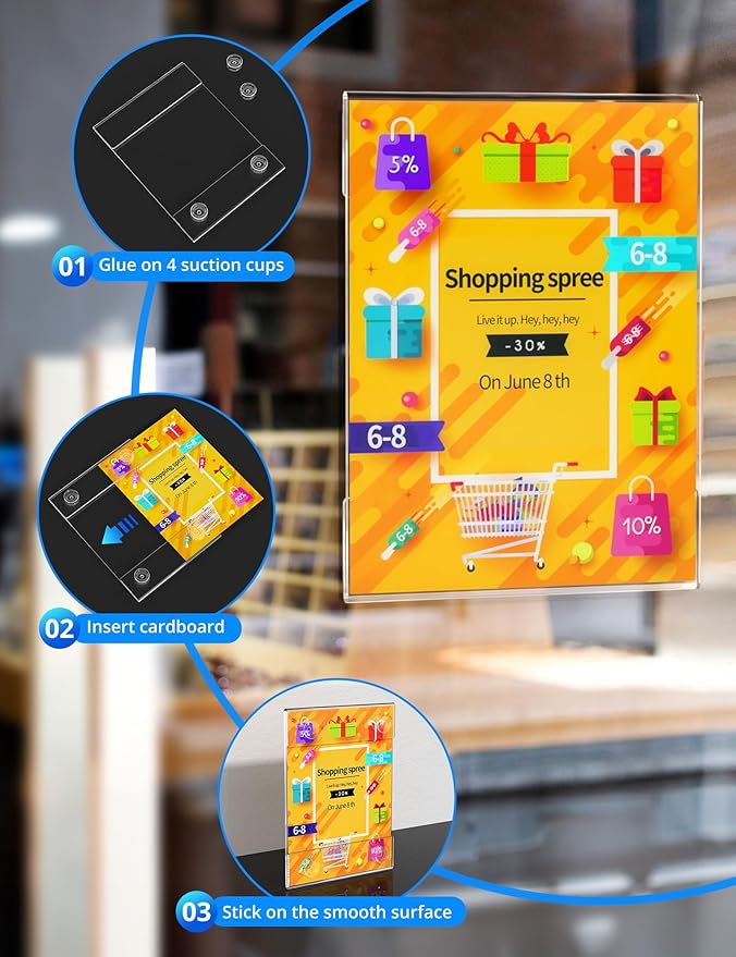 - SUITABLE SIZE - This acrylic sign holder measures 8.5 x 11 inches and can be firmly attached to the inside of the door and window glass. Use in home, office, store, restaurant, church, hospital, school, etc. Ideal for displaying information, posting photos, posters, menus, schedules, ads, discounts, and other temporary notices.