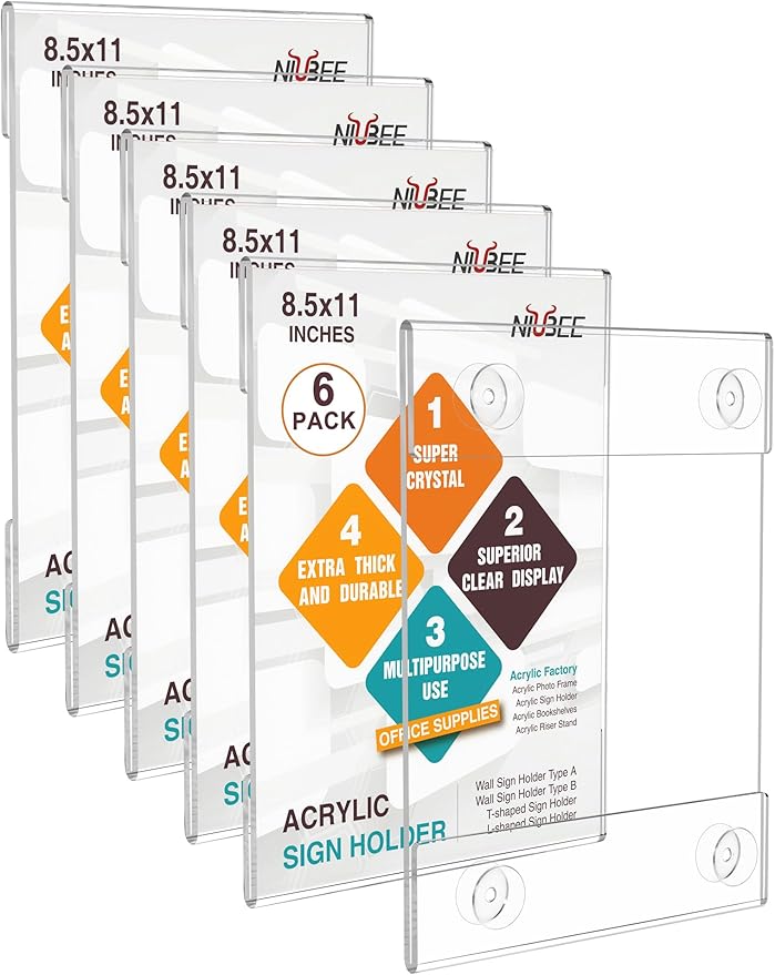 NIUBEE Acrylic Window Sign Holder with Suction Cup 8.5 X 11, Clear Acrylic Frames Glass Door Wall Mount Advertising Signage Sign Holder for Mall, Office, Home, Store, Restaurant(6 Pack)