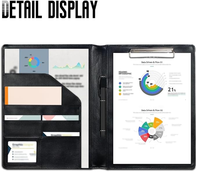 - [Multifunctional]: There is a binder on the left side; On the right, there are one large and one medium size pocket, three business card holders, and one ID window; There is also a pen holder in the middle. The multifunctional folder is convenient for storing business cards, ID cards, documents, receipts, and pens for daily use and business travel.