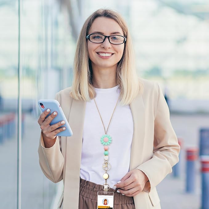 Colorful ID Badge Holder with Silicone Beads Lanyard Set,Cute Teacher Breakaway Lanyard for Keys & Keychain with Cute Retractable Badge Reel Holder,Gift for Women,Nurse, Teacher. (Daisy 1)