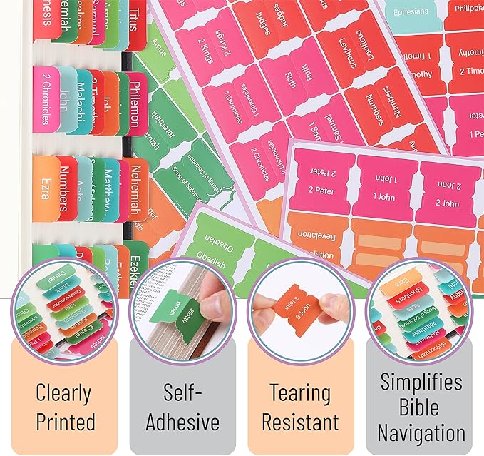 - With their large, clear font and bright printing, these bible tabs offer a convenient organizational tool for those looking to engage in Bible study or journaling.