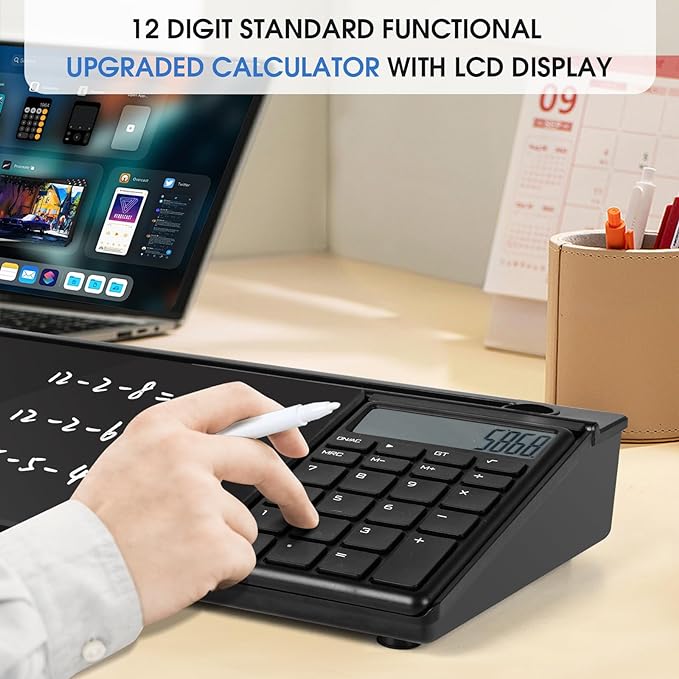 - Removable Calculator: This desk glass white board with removale calculator is an excellent creativity booster for your daily office. The upgraded 12 digit standard functional calculator with LCD display is also an aultimate tool for homework
