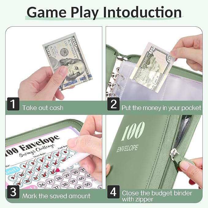 - What’s include: 8.3”x 10.5” size PU leather binder, 25 x cash envelopes pre-printed 1-100, 1 x reusable laminated tracking sheet. Aesthetic challenge book is more convenient and motivating to save money than a challenge box! It's time to make saving fun and exciting again.