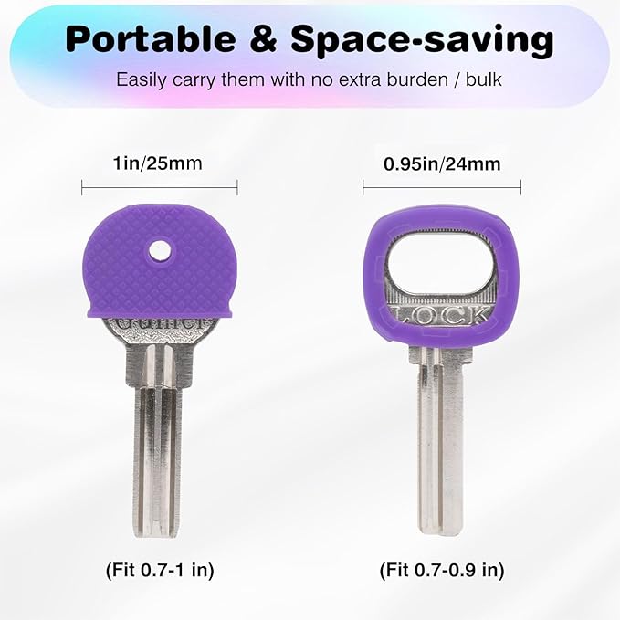 - 2-Style Key Caps: Diameter: 1" (semicircular) and 0.95" (round). The semicircular covers ONLY FIT 0.7-1 INCH thin and flat key heads. And the round caps ONLY FIT 0.7-0.9 INCH SMALL thin and flat keys. The key cap ring can fit most standard small to medium size keys (best suited for round key heads), but not motorcycle, car or Marine ignition keys or other unconventional shaped key heads.