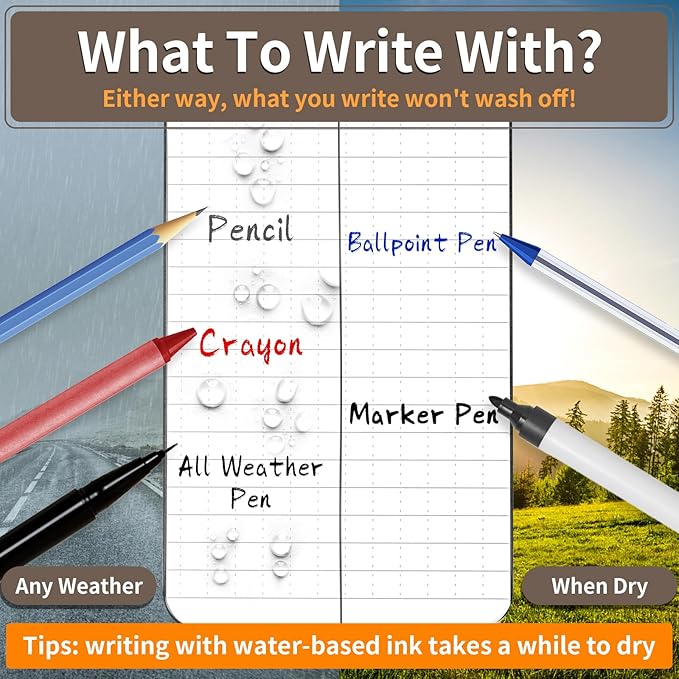 - WRITE IN THE RAIN NOTEBOOK: What to Write with? Adopting a waterproof PVC cover and stone paper. On rainy days, use a pencil or all-weather pen and your notes will stay intact. When the paper is dry, ballpoint pens and permanent markers work perfectly