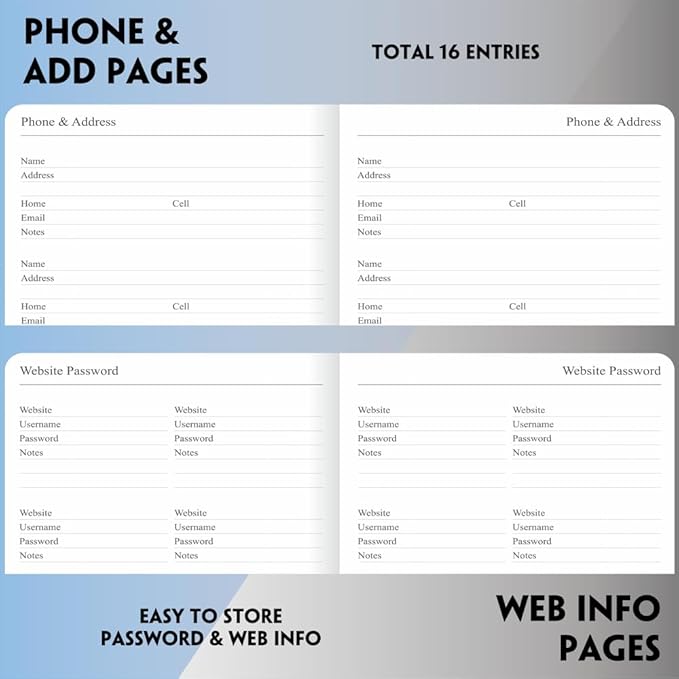 - Major holidays listed, yearly goals, important date pages, website password, address and expense pages, and 12 notes pages