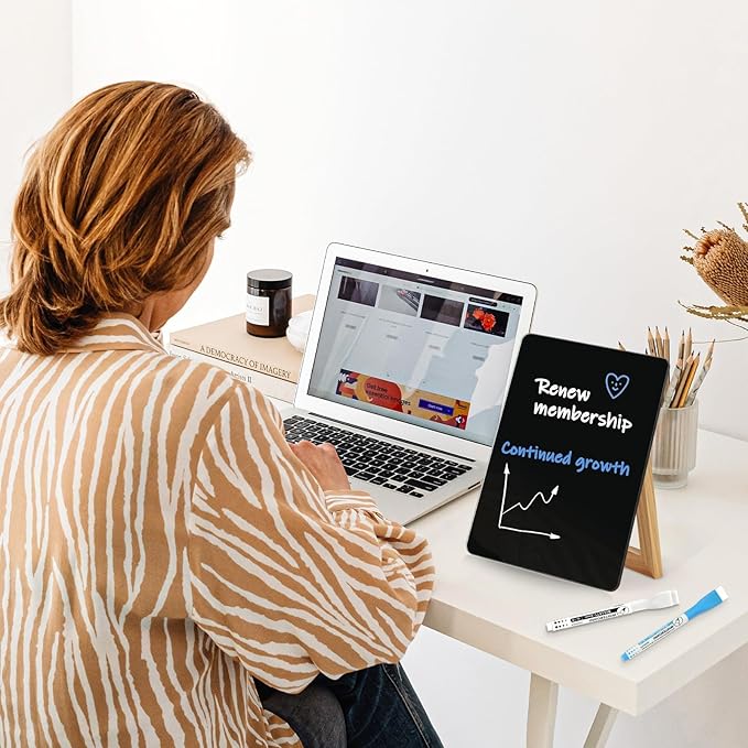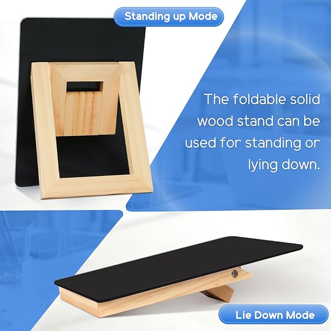 - 【Smart & Portable】WALGLASS Desk Black Dry Erase Board is compact and portable. The reversible wood stand offers the flexibility of a flat writing surface or a stand up on for easy viewing, adapting effortlessly to your needs. With its compact and portable size, this desk whiteboard is easy to carry and helps conserve usable desktop space.