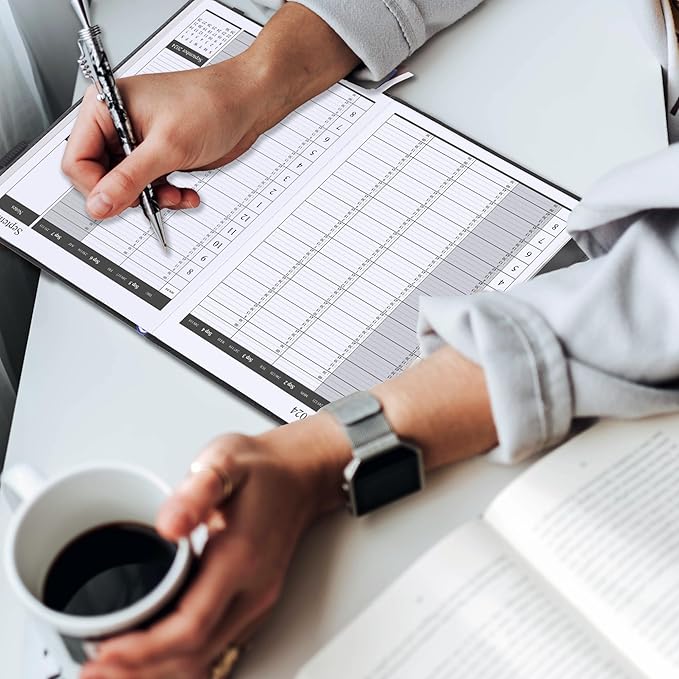 - WEEKLY & MONTHLY PLANNER: Separate weekly and monthly spreads. Weekly spread starts Sunday, ends Saturday, with columns from 8 AM to 8 PM, each hour divided into 15-minute slots.