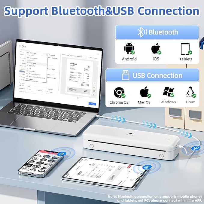 - Phomemo M834 Mobile Printer 【Upgrade 4】High Compatibility: This portable thermal printer is compatible with various devices, including Android and iOS smartphones, tablets, Windows 10/11, Linux, and macOS laptops. Simply connect it to your device via Bluetooth for smartphones or USB for PCs, and you're ready to print. It's that easy and fast! (Note: PC devices only work with USB connection and require driver installation.)