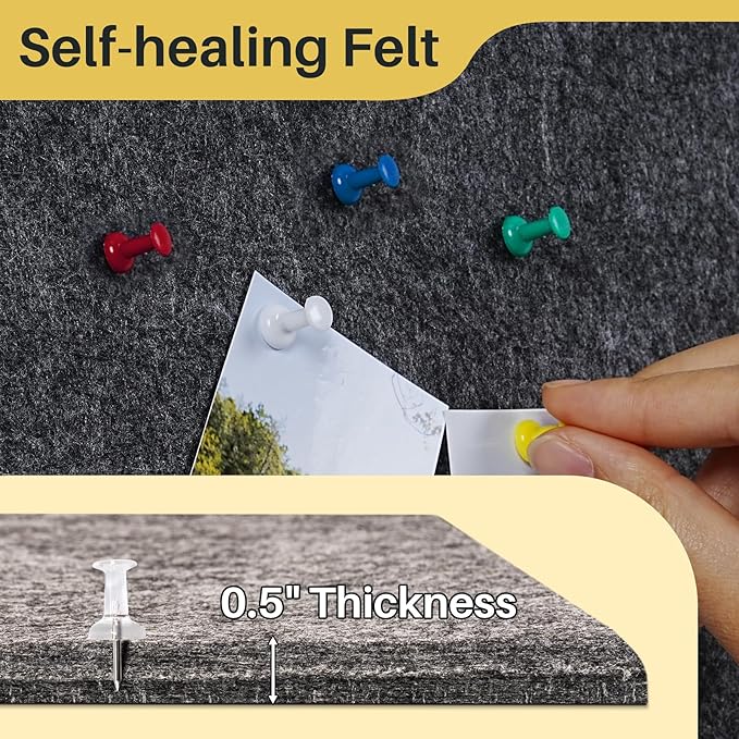 - High-Density Felt Board: Our cork bulletin board features a high-density 1/2 inch thick felt construction that holds up against multiple nailing without visible holes, and push pins will not go through your corkboards or break your wall, durability and longevity
