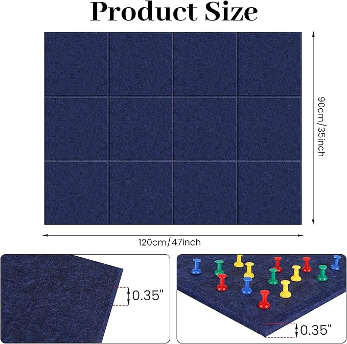 • EASY INSTALLATION & SAFE REMOVAL -Package contains 12 pieces of 11.8"x11.8"/30x30 cm, 0.35" thick high-density felt pin board, 48 pieces of double-sided safe-to-remove tape and a box damage-free to wall pin .felt cork board tiles are safe to be removed,without leaving any adhesive residue or damaging your wall paint. Please mount it on smooth areas such as glass, tiles and doors, not on uneven areas such as limestone walls. Make sure to clean surface area of wall before use