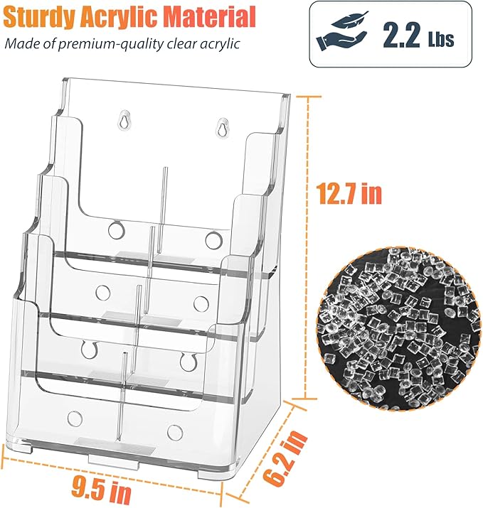 - 【ATTRACTIVE AND NON-SLIP】The back of the brochure holder slots are slightly slanted backwards, and with the ribbed texture at the bottom of each slot, the brochure will not slip off. The clear appearance of the pamphlet holder is very shiny and delicate, the acrylic material is beautiful and sturdy.