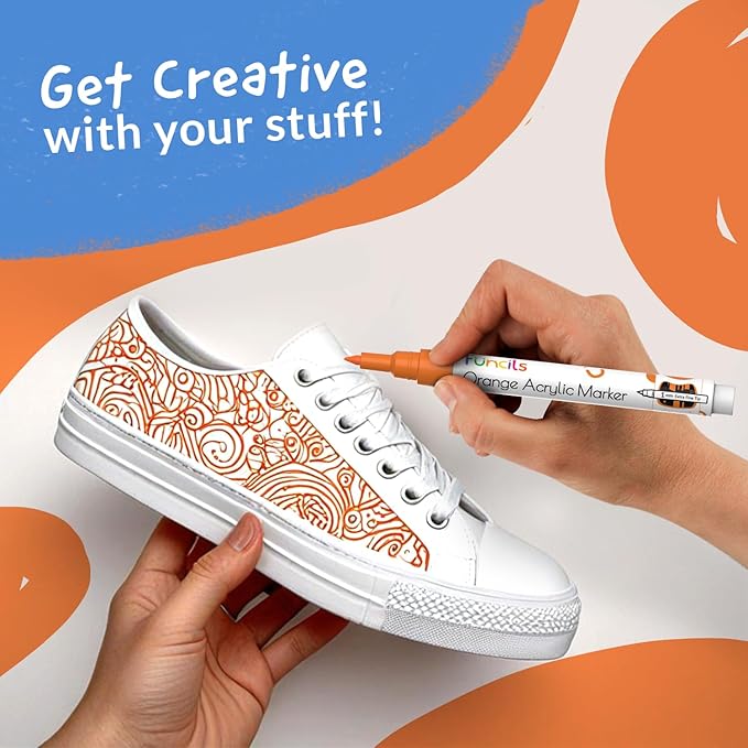 - Funcils Orange Acrylic Paint Pens - Variety PackMulti Pack: 1mm | 3mm | 6mm | 10mm | 15mm. All in one set of orange paint marker (thin and thick point). Vivid, highly pigmented acrylic ink paint pens dries quickly to produce opaque and glossy finish on light and dark surfaces (like black paper)