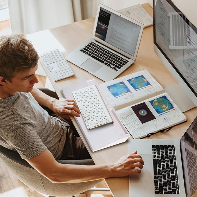 - PERFECT DESIGN: Maximize your work area. The desktop whiteboard is designed to sit perfectly between a keyboard and monitor and is slope angled for comfortable reading and writing, or typing when you are using it as a keyboard stand.