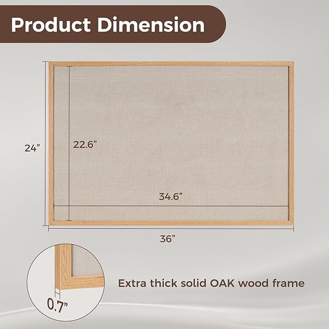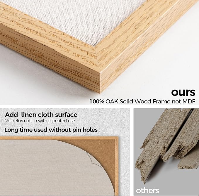 - OAK-Frame Material: Our cork boards for walls is made of 100% Oak wood which has well self-healing ability and repairability. The pin board features a four-ply splint design that is strong and thick enough not to be punctured by thumbtacks.