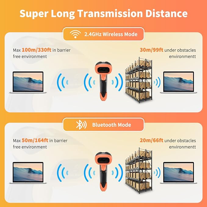 - ➤Auto Scanning & Storage Mode - Manual Scan & Auto-sensing Scan & Continuous Scan. Two working mode: Instant upload mode / storage mode. Scan and store barcodes, then update the data to your device when you come back entering the wireless transmission range. Sometimes the self-sensing scanning function is in the inactive stage, please contact us and be at your service at any time.