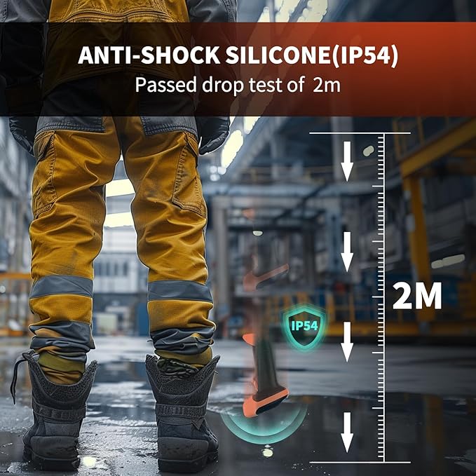 - ➤Professional Anti-Shock Design - Made of great ABS+PC materials,high shock-resistant, and the silicone protective cover can avoid the scratches and friction while falling from the height of 6.57 feet; the technical of IP54 sturdy which protect the wireless barcode scanner from dust and moisture.