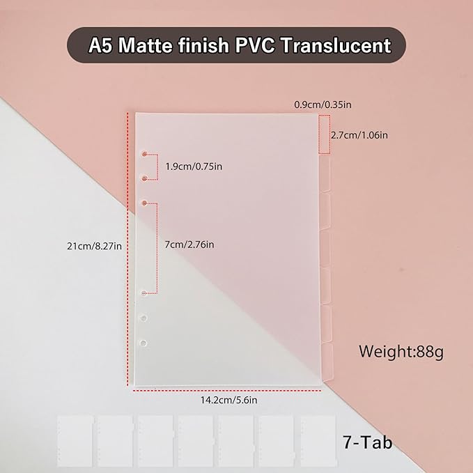 - 2. 【Fit 6-Ring A5 Binder】 - Measuring 21cm x 14.2cm / 8.2"x 5.6" (excludes tab size), our dividers are compatible with all A5-sized 6-ring journals and loose-leaf notebooks. Please ensure it fits your requirement before purchasing.
