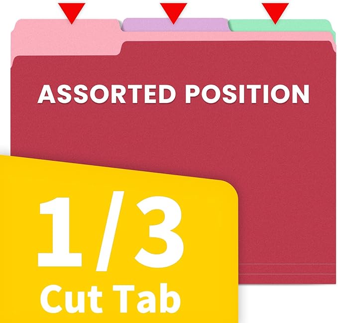 - 1/3 Cut Tab: Effortlessly navigate your files with the 1/3 cut file folder tabs design. This feature allows for clear labeling, making it simple to organize and access your documents efficiently. Keep your office tidy and organized with these easy-to-use folders.