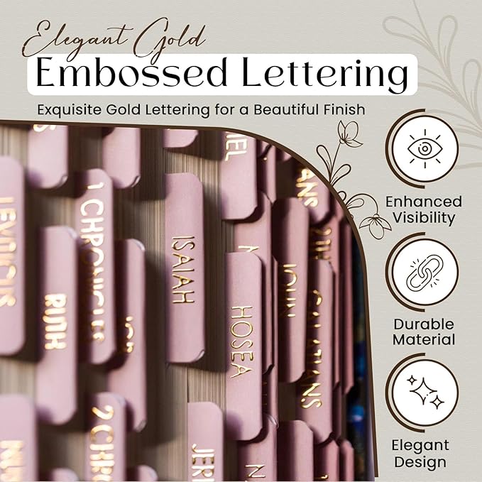 - Elegant Gold Letters: Make your Bible look beautiful with gold embossed page tabs. The elegant, all-caps font makes the mini Bible tabs look shiny and uniform, adding a touch of sophistication to your daily reading.