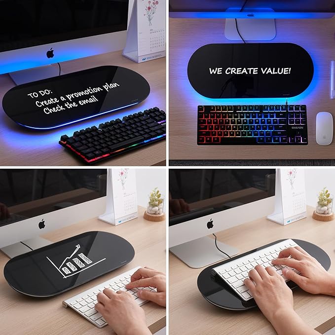 - PERSONALIZED DESIGN: The 17" X 7" desktop glass whiteboard is designed with a string of blue lights around the board, keep the usb cable plugged in, get a cool led whiteboard. The oval plate makes you feel better to hold and save more space on the table.