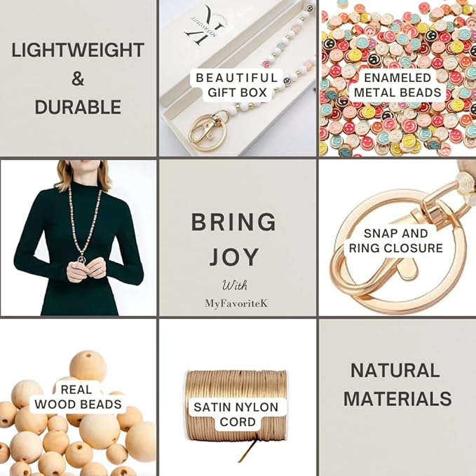 • 🥰 Bright & Cheerful Design: Features stylish and vibrant handcrafted wooden beads with soft high-quality metal smile faces and key chain, turning everyday wear into a fun and happy statement.