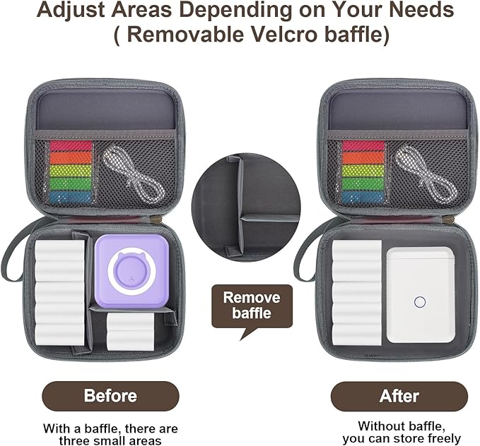- 【Removable Velcro Partition baffle】This sticker printer storage case inside is designed with a baffle with 3 partitions, which can be removable and attachable with Velcro design. You can remove the baffle to fit a more large size printer or label maker, even a camera. More flexible to fit your needs. After attaching it, the case inside will be separated as 3 parts to organize your items.