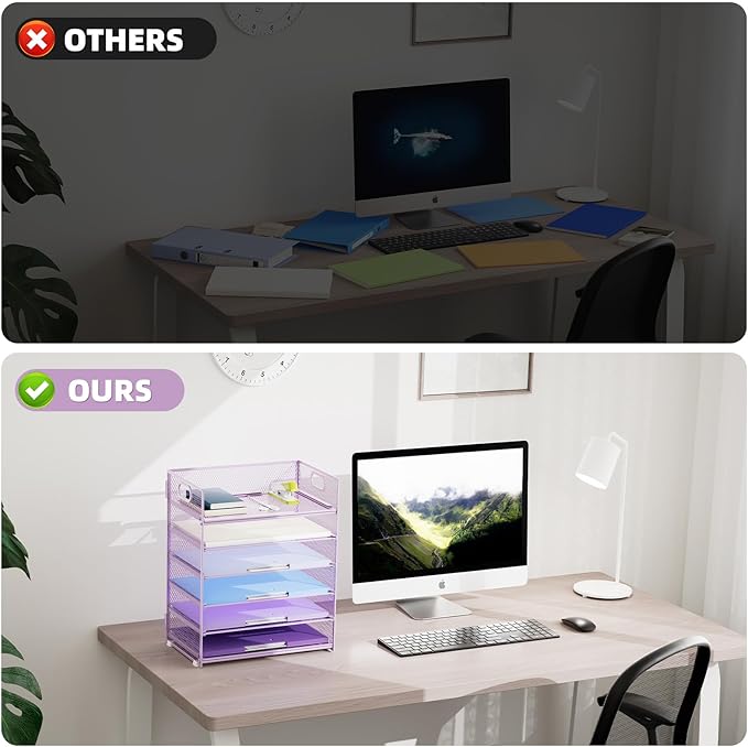 Marbrasse 6 Tier Paper Organizer - Mesh Desk File Holder with Handle, Letter/A4 Paper Sorter - Purple