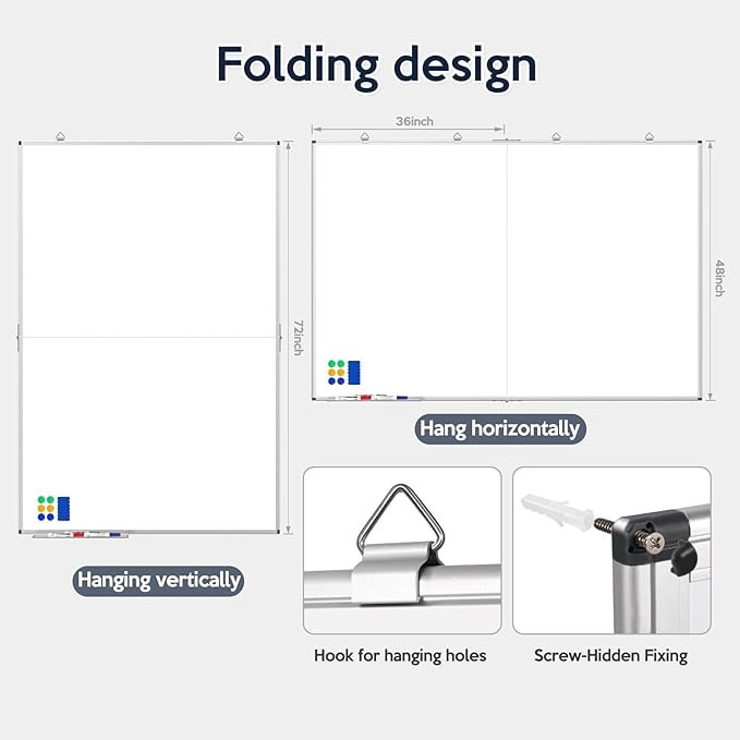 - High-Quality Construction: Our whiteboard features a smooth, durable magnetic surface that wipes clean effortlessly with any dry-erase marker. The folding design ensures stability during transit, while the anti-scratch silver-finished aluminum frame and ABS plastic corners provide enhanced durability. A detachable marker tray adds extra convenience.