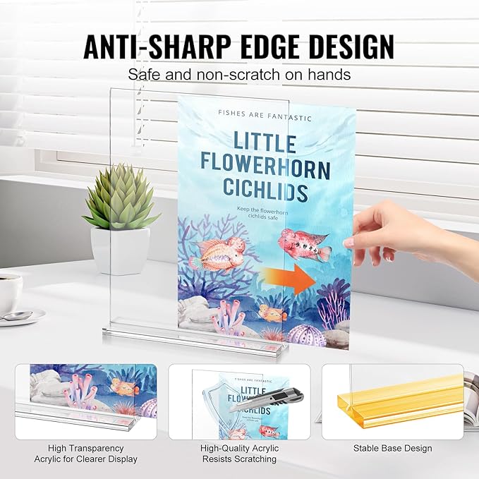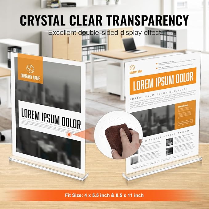 - Double Sided Display: Our clear acrylic sign holder boasts a T-shaped double-sided stand, enabling clear and stable display of pictures and posters from both sides. Supported by a sturdy base, the tabletop paper sign holder stands steadily, ensuring horizontal display for optimal visibility.