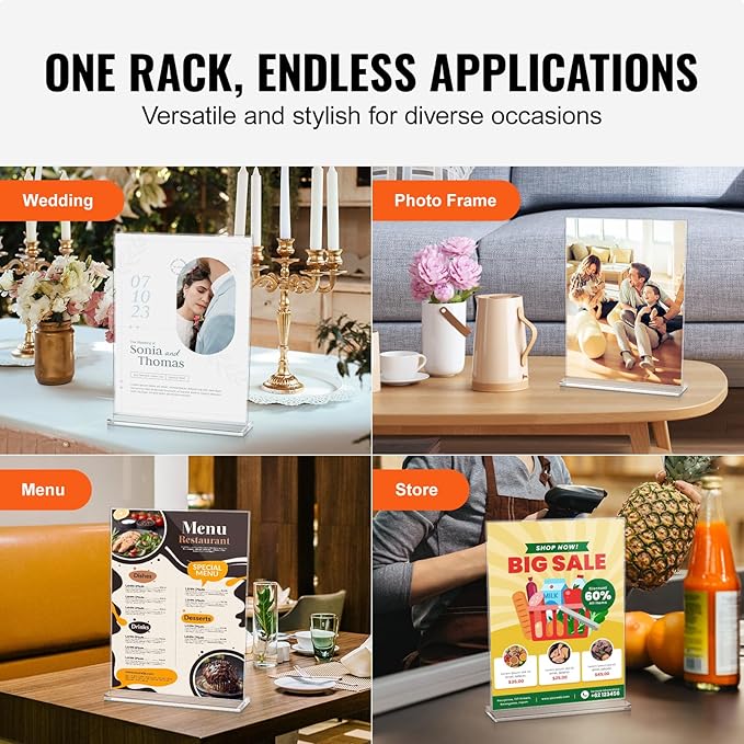 - Versatile and Stylish: Our clear acrylic table sign holder is perfect for various settings, whether it's for personal or business use. It's ideal for restaurants, bars, marketing events, fairs, promotions, trade shows, and weddings, adding a touch of elegance and professionalism to your space.