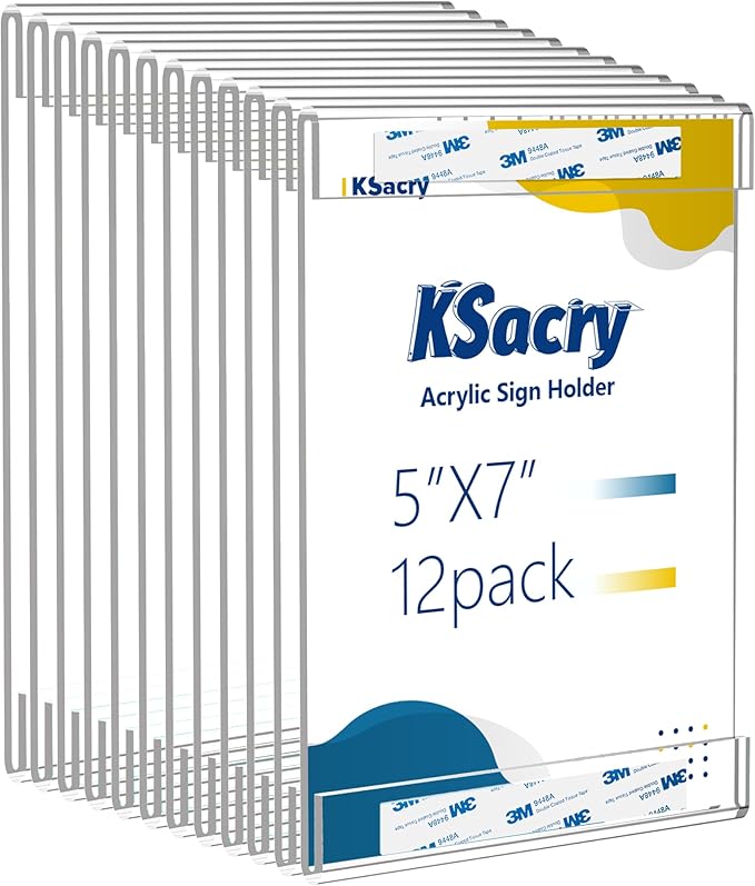 12 Pcs Acrylic Sign Holder 5 x 7, Vertical Wall Mount Sign Holders with 3M Adhesive, Clear Plastic Frames Paper Display Sign Holders for Office, Home, Store, Restaurant - No Drilling
