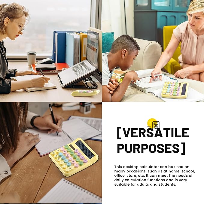 - [CUTE CALCULATOR] This desk-yellow mechanical calculator has a large 12-digit display, large buttons, and dual power supplies (solar and battery), making your work easy and enjoyable.